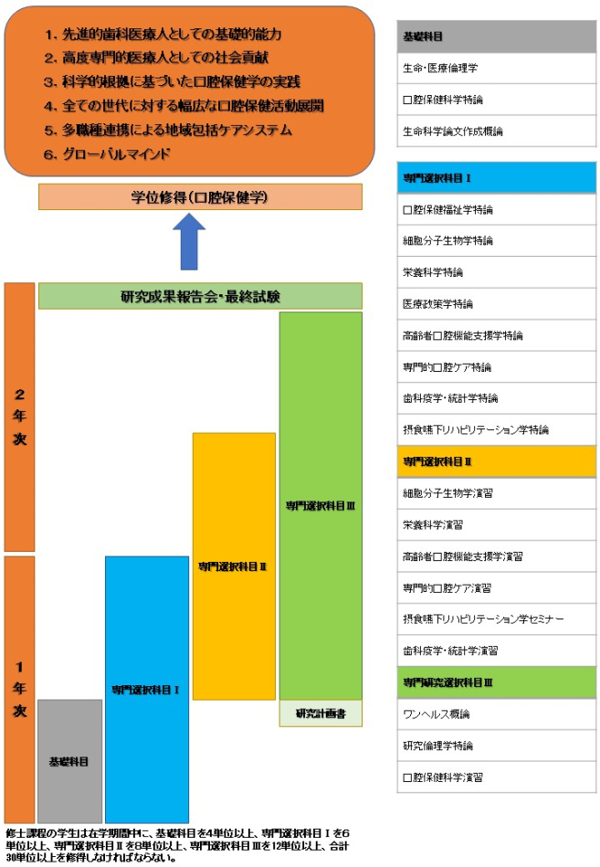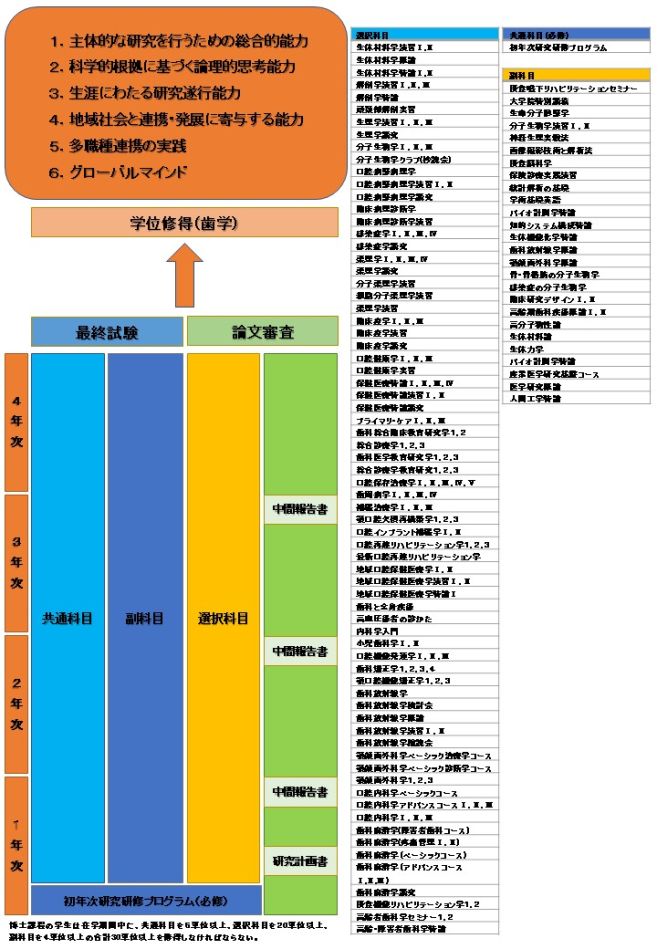 大学院歯学研究科の教育カリキュラムは、歯学に関する学術の理論および応用を研究し、その深奥を窮めて広く人類の厚生福祉ならびに文化の進展に寄与することを目的としており、各人が主体的に専攻分野に関しての研究を指導する能力を養える内容となっています。
