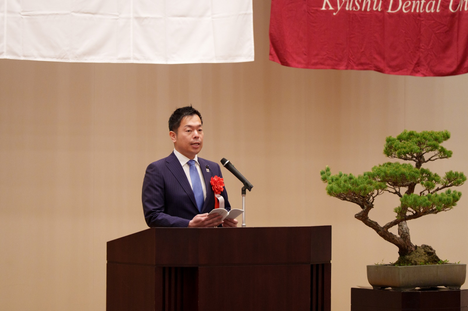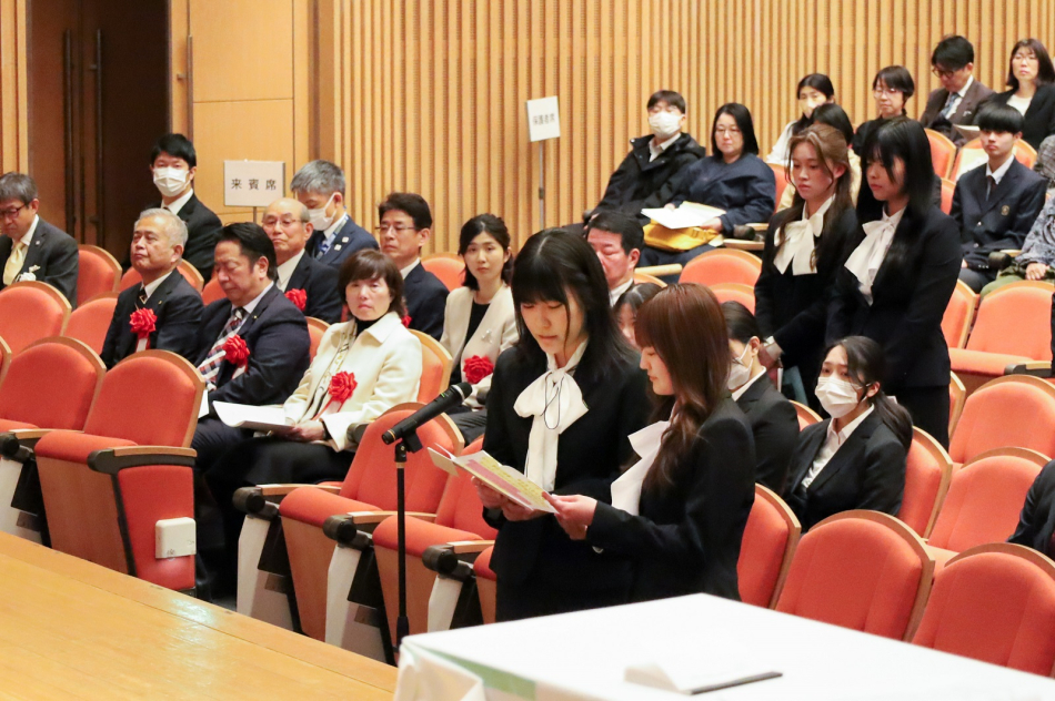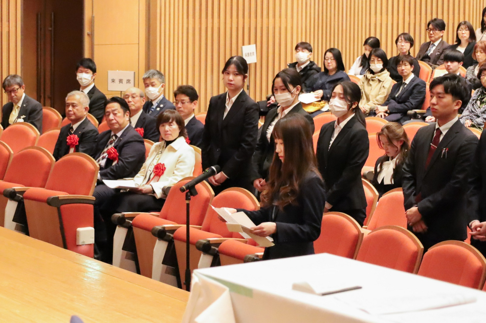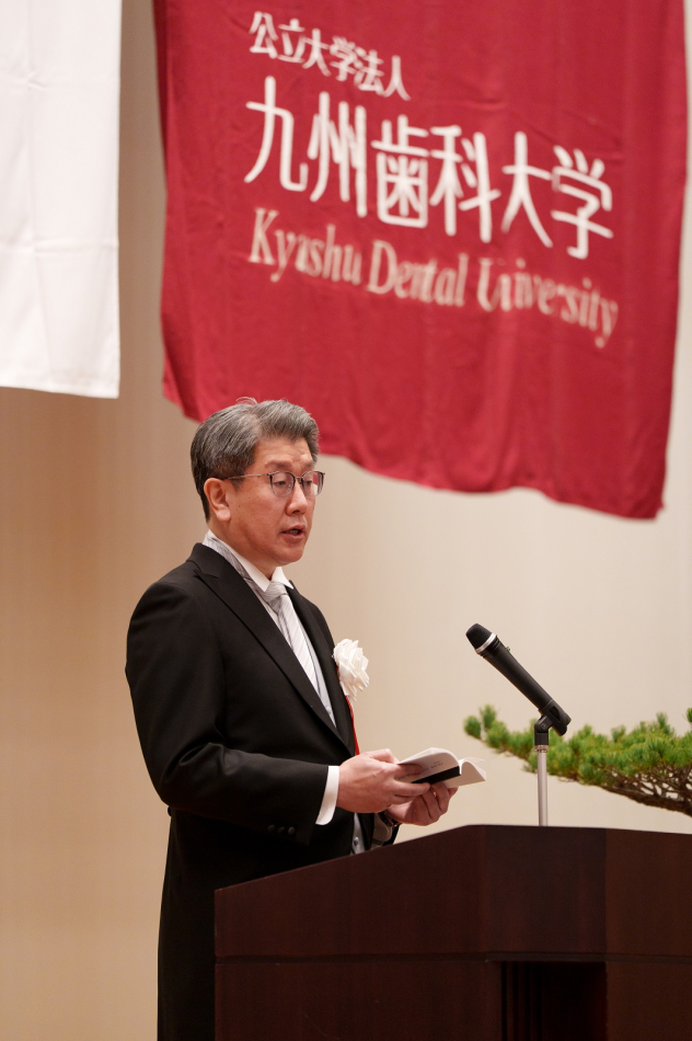 続いて、服部 福岡県知事代理の生嶋副知事、香原 福岡県議会議長代理の髙橋文教委員会副委員長から祝辞をいただいた後、学部入学生を代表して、下垣 陽菜さん(歯学科)、内海 好琴さん(口腔保健学科)、大学院入学生を代表して、松尾 実咲さん(大学院歯学専攻)が「学則を堅く守り、日々精進します。」と宣誓しました。