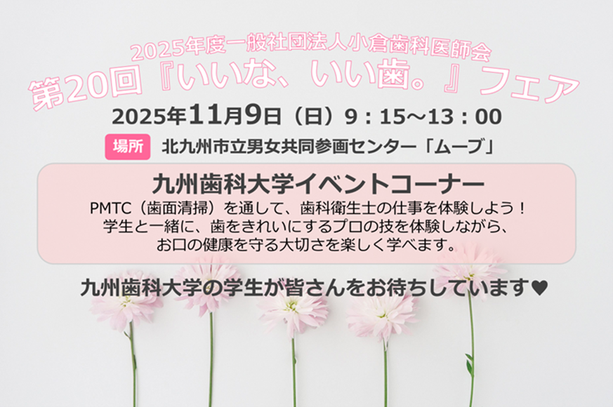 公立大学法人九州歯科大学(所在地:福岡県北九州市、学長:粟野秀慈)は、2025年11月9日(日)に北九州市立男女共同参画センター「ムーブ」で開催される第20回「いいな、いい歯。」フェア(主催:小倉歯科医師会、小倉北区すこやかライフ推進協議会)に参加し、「歯科衛生士のお仕事を体験してみよう!」をテーマとした体験ブースを出展します。